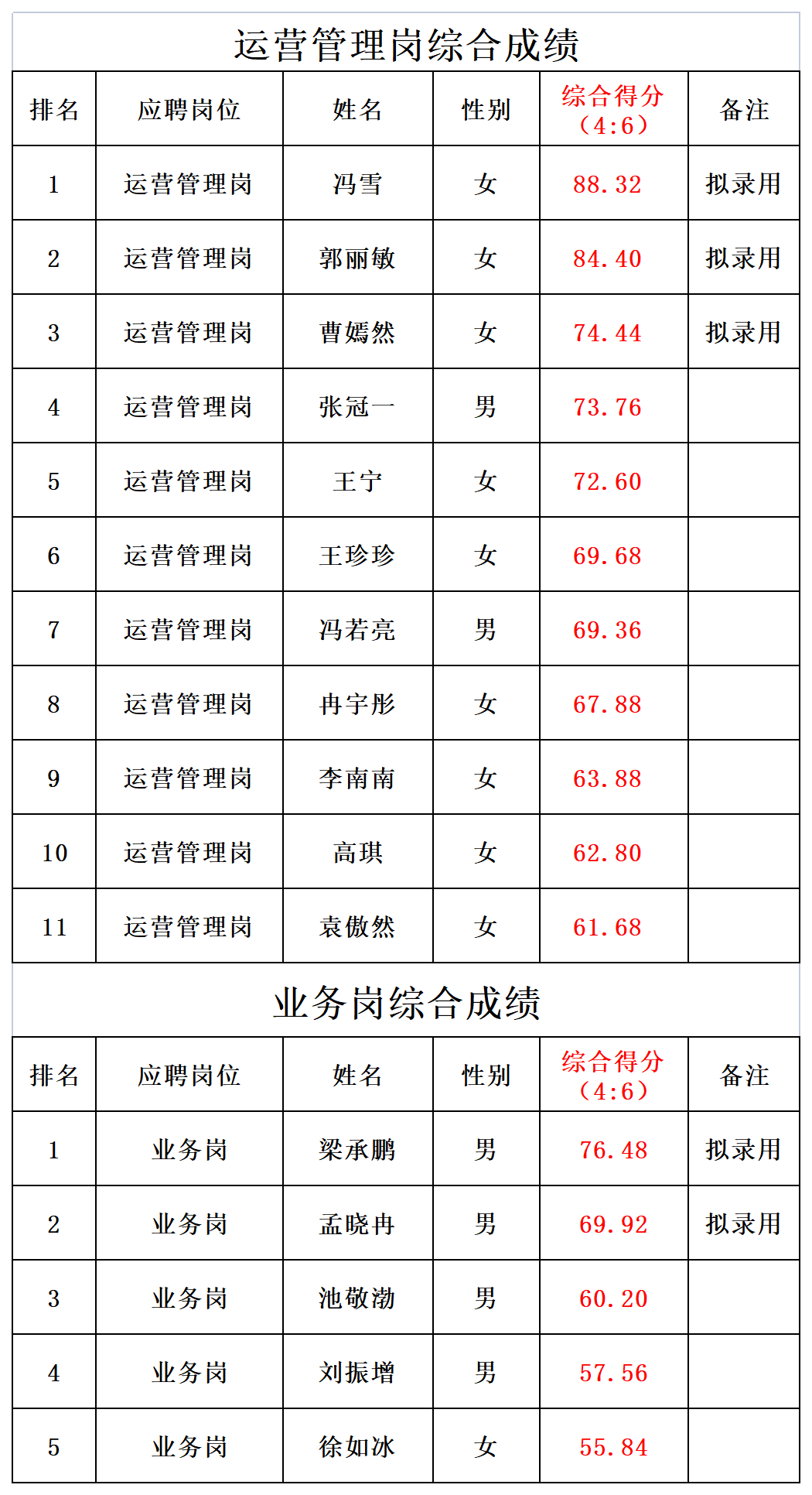 经资格审查、笔试、面试等程序。按笔试成绩占比40%,面试成绩占比60%计算综合成绩,择优录用。根据公司实际用工需要,结合竞聘人员综合素质情况,运营管理岗计划增加1人。现将综合成绩及拟录用派遣人员名单予以公示。